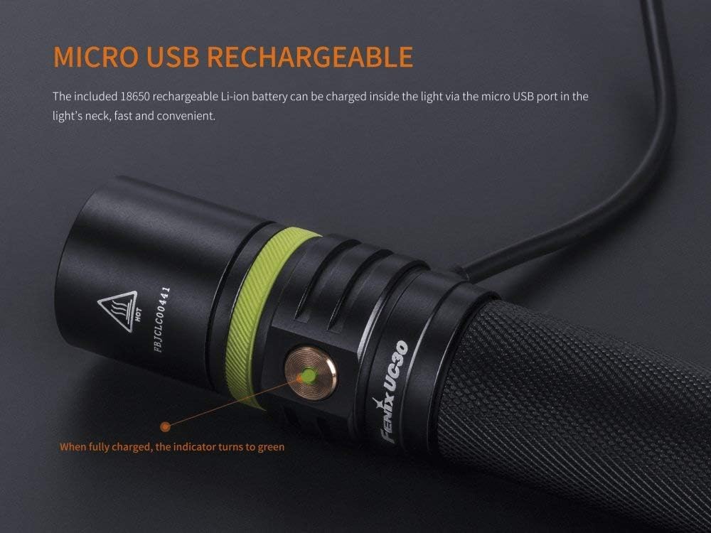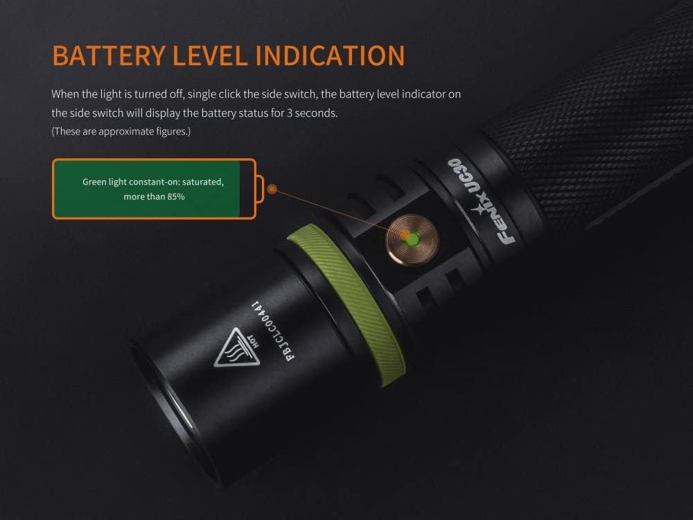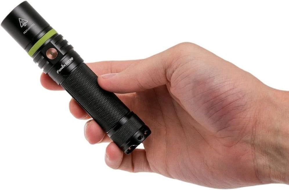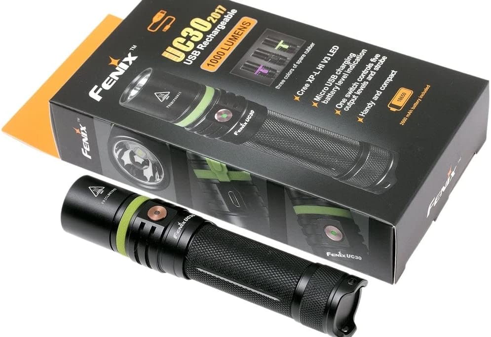 مصباح فينيكس UC30 LED إصدار 2017، يتميز بقوة إضاءة تصل إلى 1000 لومن، ومدة تشغيل قصوى تصل إلى 150 ساعة. مزود بمصباح Cree XP-L HI V3 LED، الذي يمنحه قوة إضاءة تبلغ 1000 لومن، مسافة إضاءة مذهلة تبلغ 830 قدمًا. يعمل مصباح فينيكس UC30 LED ببطارية واحدة من نوع 18650، أو بطاريتين CR123A غير قابلتين لإعادة الشحن. يتميز هذا المصباح اليدوي سهل الحمل بغطاء مطاطي أخضر مضيء، بالإضافة إلى مؤشر لحالة البطارية على المفتاح الجانبي المصنوع من الفولاذ المقاوم للصدأ. كما يتميز هذا المصباح القابل لإعادة الشحن بخاصية القفل، مما يجعله قطعة أساسية في مجموعة أدواتك اليومية. الميزات: - يستخدم Cree XP-L HI V3 LED بعمر افتراضي يصل إلى 50000 ساعة - يعمل ببطارية ليثيوم أيون قابلة لإعادة الشحن 18650 أو بطاريتين ليثيوم CR123A - قابلة لإعادة الشحن عبر Micro USB - وظيفة القفل - مؤشر مستوى البطارية - مفتاح جانبي من الفولاذ المقاوم للصدأ لاختيار الإخراج - غطاء مطاطي أخضر USB مضيء - دائرة ذاكرة ذكية - يحافظ الإخراج المنظم رقميًا على سطوع ثابت - تحذير الجهد المنخفض يذكرك عندما تكون هناك حاجة لشحن البطارية - حماية من عكس القطبية للحماية من إدخال البطارية بشكل غير صحيح - حماية من الحرارة الزائدة تحمي من درجة حرارة السطح العالية - مصنوع من الألومنيوم المتين المستخدم في صناعة الطائرات - نوع III الممتاز من الألمنيوم المؤكسد الصلب المضاد للتآكل - عدسة زجاجية فائقة الوضوح مقواة مع طلاء مضاد للانعكاس المواصفات: - 5 مخرجات بالإضافة إلى وضع الستروب: توربو: 1000 لومن عالي: 350 لومن متوسط: 150 لومن منخفض: 50 لومن اقتصادي: 5 لومن ستروب: 1000 لومن - وقت التشغيل: توربو: 1 ساعة و25 دقيقة عالية: 3 ساعات و20 دقيقة متوسطة: 8 ساعات و45 دقيقة منخفضة: 28 ساعة و25 دقيقة اقتصادية: 150 ساعة وميض: / - المسافة: توربو: 253 متر عالية: 156 متر متوسطة: 101 متر منخفضة: 58 متر اقتصادية: 21 متر وميض: / - الكثافة: توربو: 16000 شمعة عالية: 6080 شمعة متوسطة: 2550 شمعة منخفضة: 840 شمعة اقتصادية: 110 شمعة وميض: / - مقاومة الصدمات: 1 متر - حماية مصنفة IP68: قابل للغمر حتى عمق 6.5 قدم/2 متر تأكد من وضع غطاء USB على قدرة مقاومة الماء - الطول: 130 مم - قطر الرأس: 25.4 مم - قطر الجسم: 23.4 مم - الوزن: 77 جرامًا (باستثناء البطارية)