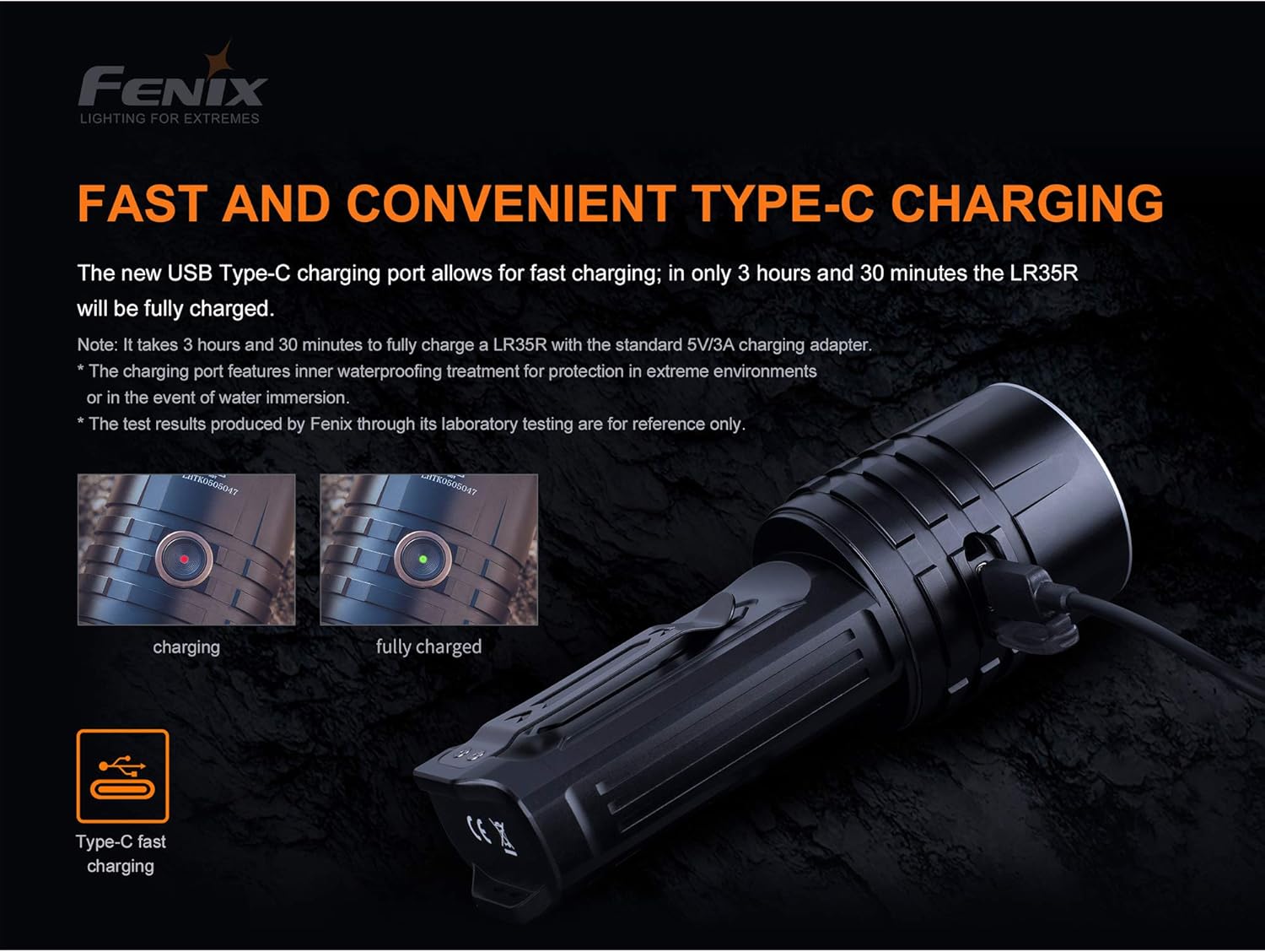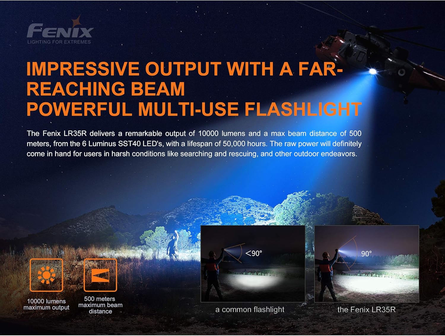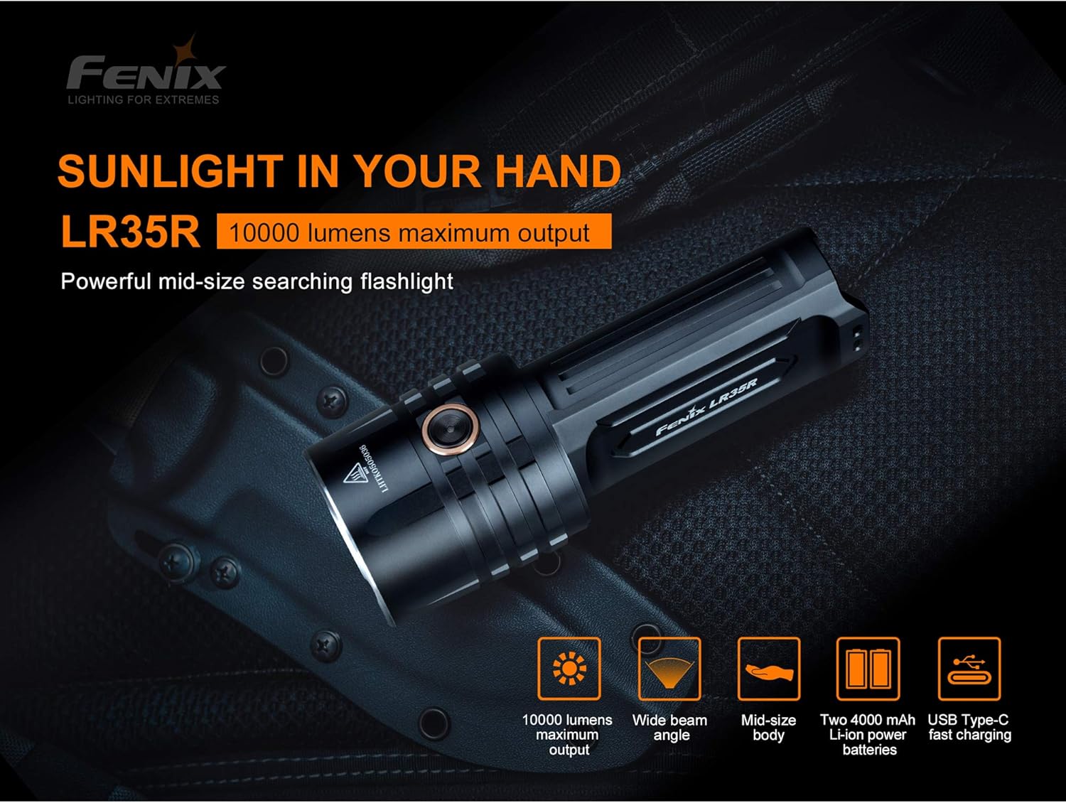 يصدر مصباح Fenix LR35R شعاعًا قويًا يصل إلى 10000 لومن، وهو مثالي لعمليات البحث والإنقاذ والمغامرات الخارجية مثل الصيد أو استكشاف الكهوف.