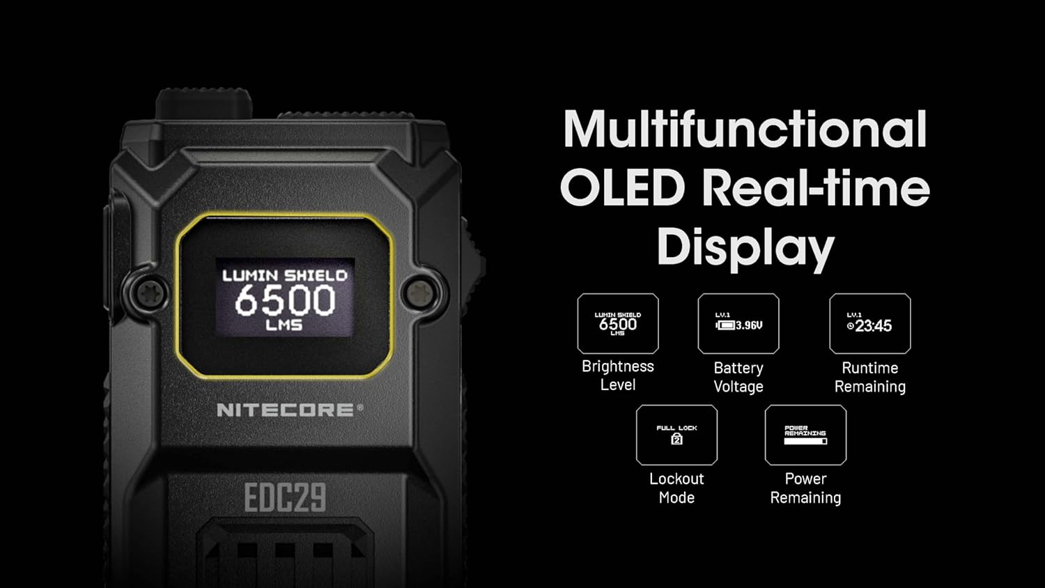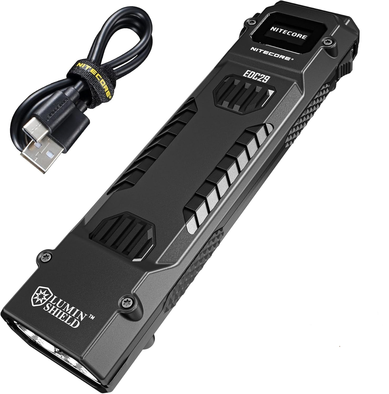 يعتمد مصباح EDC29 على مصباح EDC27 الشهير، ويوفر 6500 لومن بتصميم نحيف ومسطح. شكله المستطيل الأنيق، بسُمك 0.89 بوصة وطول 5.3 بوصة، يُسهّل وضعه على سطح مسطح، أو حمله في الجيب، أو تثبيته على الحزام.